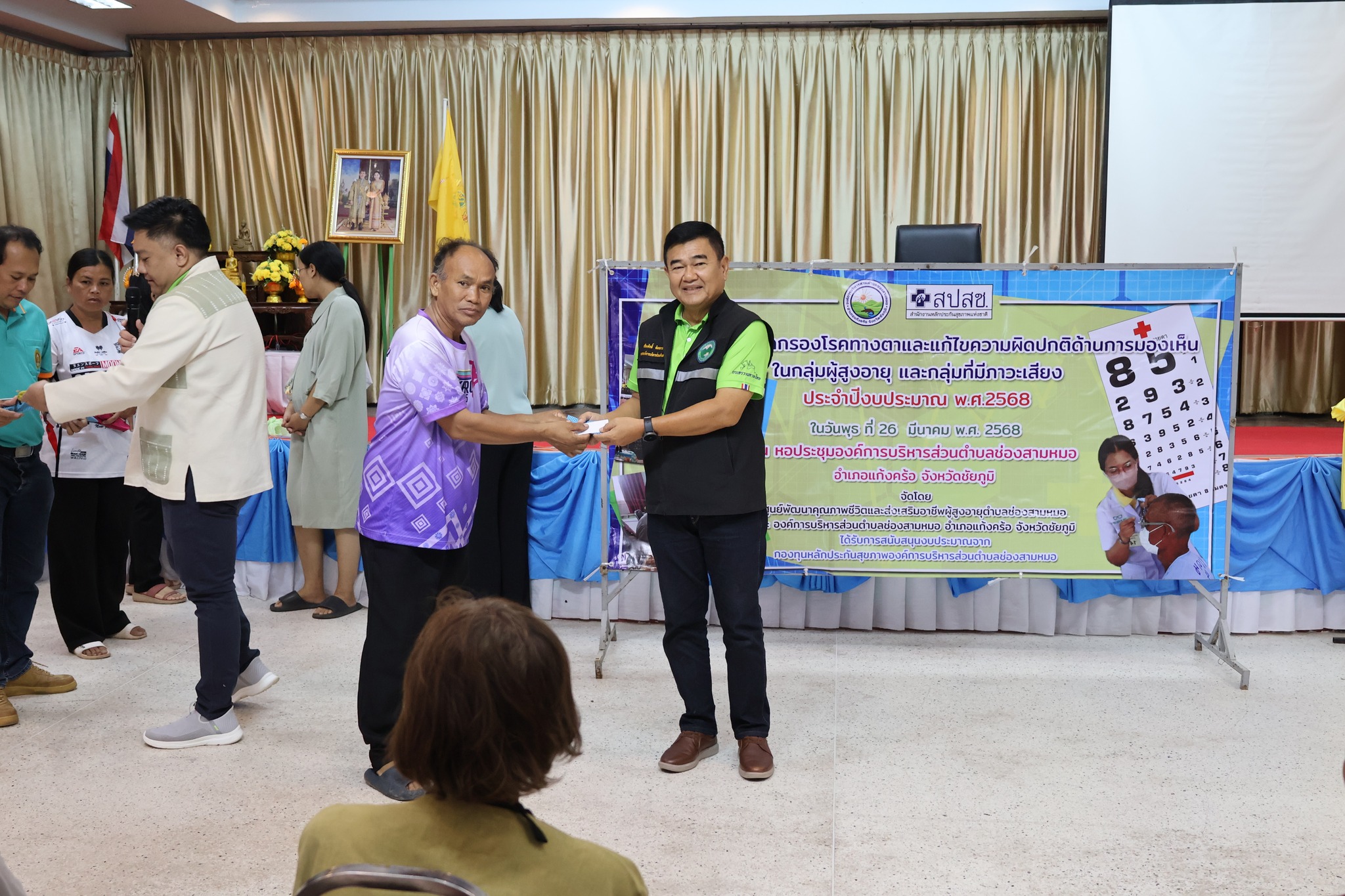 วันที่ 28 พฤษภาคม 2568 เวลา 10.00 น. นายเรืองศักดิ์ ดิลกลาภ นายกองค์การบริหารส่วนตำบลช่องสามหมอ ส่งมอบแว่นตาให้ผู้สูงอายุและกลุ่มที่มีภาวะเสี่ยง ที่เป็นกลุ่มเสี่ยงตรวจพบความผิดปกติทางตา ตามโครงการตรวจคัดกรองโรคทางตาและแก้ไขความผิดปกติด้านการมองเห็นในกลุ่มผู้สูงอายุ และกลุ่มที่มีภาวะเสี่ยง ประจำปีงบประมาณ พ.ศ. 2568 ที่ได้รับการสนับสนุนงบประมาณจากกองทุนหลักประกันสุขภาพองค์การบริหารส่วนตำบลช่องสามหมอ ณ หอประชุมองค์การบริหารส่วนตำบลช่องสามหมอ อำเภอแก้งคร้อ จังหวัดชัยภูมิ